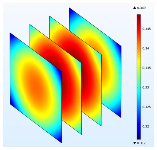 The voltage of the top electrode was initially set according to the calculated results. The value was tuned with a trial and error method and finalized when predicted results were matched with the experimental temperature pattern and evaporation rate of samples []. The bottom electrode was set as grounded (V = 0). The metal enclosure of the RF cavity was regarded as the ideal conductor and was defined as electrical insulation (∇E = 0). Other initial and boundary conditions are listed in Table 1.