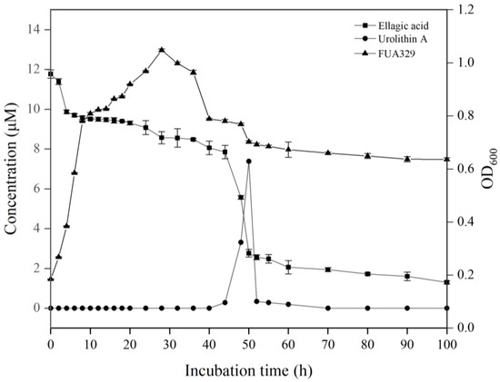 | Time/h | Concentration of Ellagic Acid (μM) | Concentration of Urolithin A (μM) | OD600 Value of Strain FUA329 |