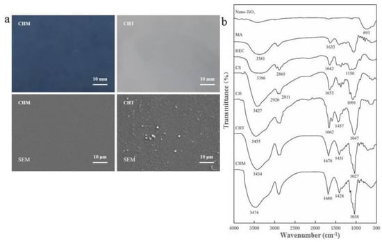 The compatibility between the materials can be analyzed through SEM plots by evaluating the roughness of the material surfaces. A greater surface roughness indicates low compatibility, whereas flatter and smoother surfaces indicate greater compatibility between the materials [36]. The apparent morphology and SEM images of CHM and CHT are shown in Figure 2. It is clear from the apparent morphology that both CHM and CHT have a flat and smooth appearance in addition to uniform texture and color, without any breakage, bubbles, and holes. The CHM presents a smooth, flat, and uniform surface without producing any fractures, micropores, or protrusions, which indicates good compatibility between each material added to CHM. MA was uniformly dispersed in the CH matrix and exhibited a slightly rougher surface than CHM, even though it presented a completely dense image. The bacterial inhibitory effect of the materials increased as the concentration of the nanoparticles increased. However, when the concentration of the nanoparticles was significantly high, agglomeration occurred in the matrix, leading to adverse effects on its various properties. From the SEM image, it can be observed that the nano-TiO2 particles in the CHT are more dispersed in the matrix and no aggregation occurs, which indicates that the addition of nano-TiO2 in CHT is appropriate. This indicates a positive effect on the water vapor transmission coefficient and the mechanical properties of the material [16].