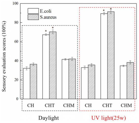 The broad-spectrum bacteriostatic rates of CH, CHT, and CHM under different light treatments. The symbol of “*” indicates that the data are significantly different (p < 0.05).