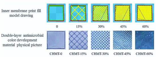 The outer film-forming solution was prepared by accurately weighing 1% (w/v) nano-TiO2 and adding it to the pre-configured CS/HEC substrate solution. This solution was stirred at room temperature until nano-TiO2 was uniformly dispersed in the CS/HEC substrate solution. Subsequently, nano-TiO2 was removed by ultrasonic de-bubbling for 60 min and left aside. The inner film-forming solution was prepared by accurately weighing 0.5% (w/v) MA and adding it to the pre-configured CS/HEC substrate solution. The solution was stirred at room temperature until MA was completely dissolved in the CS/HEC substrate solution. The solution was removed after a uniform color was obtained. Subsequently, the bubbles were removed by ultrasonication for 60 min, after which the solution was left aside. The outer film was prepared by slowly and evenly pouring the outer film solution (20 mL) onto a glass plate with dimensions of 15 cm × 15 cm, which was then placed in an oven at 45 °C for 30 min. The glass plate was removed when the surface of the outer film reached a solid and viscous semi-dry state. The glass plate was then left aside. The procedural steps for the preparation of the double-layer antibacterial chromogenic material are shown in Figure 1. The outer layer film (in a semi-dry state) was placed in the printing area of the 3D printer (3DP; PR-D3, Sichuan Foster company, (Chengdu, China), which was filled with the inner-layer film-forming solution. The instrument was run, and a bottom-removing single layer was printed. The first film was removed after printing, dried in an oven at 30 °C for 30 min, and subsequently removed and dried naturally for 24 h. The films were then stored. Five bilayer, antimicrobial, and chromogenic materials were obtained by varying the filling rate of the inner layer (0%, 15%, 30%, 45%, and 60%).