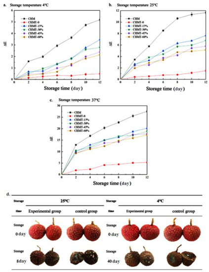 In this experiment, the color stability of each material was studied at three different temperatures, and the results were expressed as the total color difference change value ΔE. A smaller change in color difference indicates that the material is more stable during storage. When ΔE < 3.5, it can be inferred that the change in color cannot be perceived by the naked eye. As shown in Figure 5, all six materials underwent varying degrees of color change during storage. The total color variation value increased gradually with storage time, and the degree of change decreased with decreasing temperature (37 °C > 25 °C > 4 °C). This was caused by the reaction of the diphenylchroman cation in the anthocyanins, which were transformed into chalcone and pseudobase and caused the overall color change of the materials. The degradation rate of the anthocyanins was accelerated at high temperatures, and the rate of change of color was further accelerated. CHM was the least stable at all three storage temperatures, which indicated that the outer material could provide some protection to the anthocyanins added to the inner material. Except for the two materials mentioned above, the stability of the remaining four bilayer materials increased with increasing print fill rate, and CHMT-60% exhibited optimal stability with ΔE values (12th day of storage) of 2.14 ± 0.08, 5.14 ± 0.15, and 17.32 ± 0.42 at 4 °C, 25 °C, and 37 °C, respectively. With increasing print fill rate, the anthocyanin added to the inner-layer material gradually decreased the specific surface area, while the chitosan/hydroxyethyl cellulose matrix played a protective role against anthocyanins, which, in turn, led to an improvement in anthocyanin stability [42]. The comparative chart of the litchi storage period is shown in Figure 5. The relative humidity of the litchi storage environment was approximately 85–95%. It can be observed from Figure 5 that the litchi fruit in the control group experienced serious water loss after storage compared to the experimental group. The reduction in fruit volume was higher and the area of the mold was larger. From the above results, it can be noted that the double-layer antibacterial chromogenic material can effectively delay water loss from litchi fruit, and to a certain extent, inhibit litchi spoilage. According to the above experimental results, CHMT-45% exhibited the best overall performance. Hence, it was selected for further testing of the freshness and intelligent color development effect of litchi.