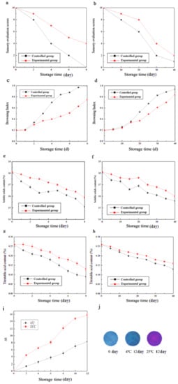 Figure 6 depicts the sensory evaluation score curve of litchi during storage, and it can be observed from Figure 6 that with the extension of storage time, the sensory evaluation scores of litchis in each group were gradually reduced. However, the sensory evaluation scores of litchis stored at 25 °C (Figure 6a) were significantly higher than those stored at 4 °C (Figure 6b). The sensory evaluation scores of the experimental group were always higher than those of the control group during storage. The control group, stored at 25 °C, exhibited the highest sensory evaluation scores. In the first two days of storage, the color of the litchi peel was bright red; the flesh was full, soft, and moderate, with a unique litchi fruit flavor, and the differences with respect to the experimental group were small. On the fourth day, the control group litchi peel turned brown, with flesh softening and turning yellow. Moreover, the taste of the fruit became slightly off-flavored with a sour taste, and the differences with respect to the experimental group increased significantly. Low-temperature storage can significantly extend the shelf life of litchi. On the 40th day of storage, the litchi peel control group was extremely moldy. A large amount of water loss resulted in a reduction in the fruit volume and the flesh texture was soft with extreme decay and deterioration. A significant odor was observed and the fruit was inedible. The experimental group of the litchi peel contained a small amount of mold. The flesh was slightly shriveled and with a slight odor; the fruit was inedible.