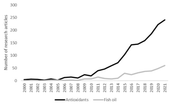 Chronological evolution in the number of research articles about microencapsulation of fish oil and natural antioxidants in the last two decades (data obtained from Web of Science, November 2021).