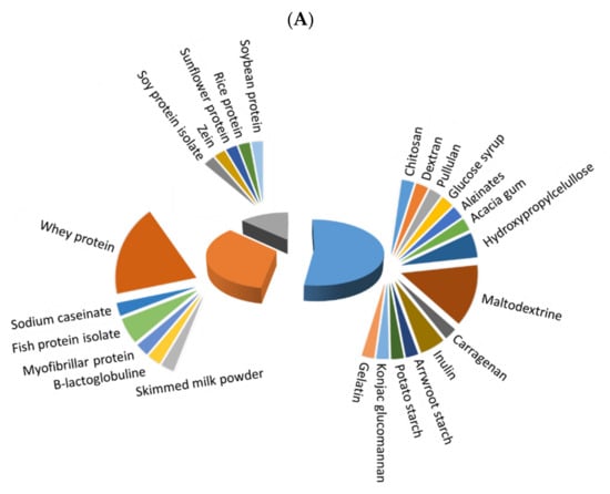 Extent of use of saccharides (blue), vegetable proteins (grey) and animal proteins (orange) as wall material for microencapsulation of fish oil (A) and natural antioxidants (B).