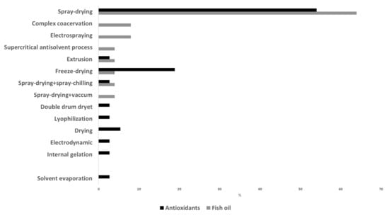 In this context, there has been an increasing interest in the microencapsulation of EPA and DHA sources, mainly fish oil, and natural antioxidant compounds. This is reflected in the number of publications on these topics, which has experienced a significant increase in the last few years (Figure 1). However, to the best of the authors’ knowledge, no specific review on these topics has been recently published. Thus, the present work aims to review the most recent developments in the microencapsulation of fish oil and natural antioxidant compounds to fortify foods, focusing on the key objectives of the developments and the quality evaluation of the microcapsules.