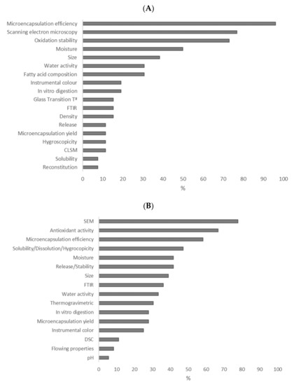 Before microencapsulation, a stable emulsion/solution must be prepared, and its constituents strongly influence the quality of obtained microcapsules. Figure 2 depicts the extent of use of different polymers for microencapsulation of fish oil (Figure 2A) and antioxidants (Figure 2B), with three main different types: saccharides, which were the most frequently used, followed by animal and vegetable proteins. The extent of use of saccharides has been higher for microencapsulated antioxidants in comparison to fish oil microencapsulations (77.8 vs. 52.6%, respectively), while animal proteins have a higher degree of use for fish oil than for antioxidant microencapsulation (34.2% vs. 11.1%), and both types of microcapsules showed a similar extent of use of vegetable proteins (13.16% and 11.11, respectively). Whey protein (isolate (WPI) or concentrate (WPC)) and maltodextrin have been predominantly used in most recent studies on fish oil microcapsules. In the case of antioxidant microcapsules, maltodextrin is the most preferred wall material, but others, as Arabic gum, chitosan, pectin, WPI, inulin and zein, are also remarkable. In addition, distinguishing between plant (including most saccharides and vegetable proteins) and animal-based materials (animal proteins, chitosan, gelatin and collagen), a higher percentage of plant-based materials (in more than 65% of the reviewed papers) in comparison to animal-based ones is noted in both fish oil and antioxidant microencapsulation.