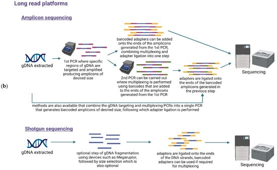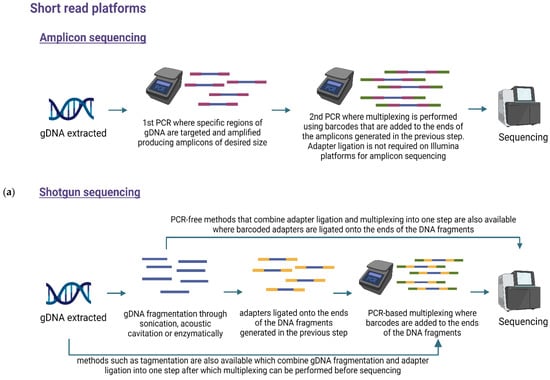 Overview of library preparation steps for amplicon and shotgun sequencing on (a) short read platforms such as Illumina, and (b) long read platforms such as PacBio and ONT [,]. This figure was created with BioRender.com.