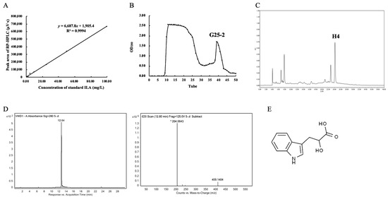 Screening of high ILA-producing strains and purification of ILA from L. plantarum ZJ316. (A) Standard curve of ILA by RP-HPLC. (B) Separation of the 50% methanol eluent with Sephadex G–25 column. (C) Purification of the fraction G25–2 by RP-HPLC. Elution “H4” was collected. (D) Identification of ILA by LC-MS. (E) Molecular structure of ILA.