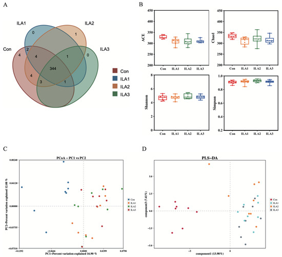 Alpha diversity and beta diversity analysis of bacterial communities in fecal fermentation samples. (A) Venn diagram of microbial compositions on OTU level. (B) Alpha diversity including the ACE, Chao1, Shannon and Simpson indexes based on OTU level. There were no significant differences in the microbial richness and diversity between the Con and ILA groups (p > 0.05). (C) PCoA plots at genus level based on unweighted UniFrac analysis. (D) PLS-DA plots at genus level based on unweighted UniFrac analysis.