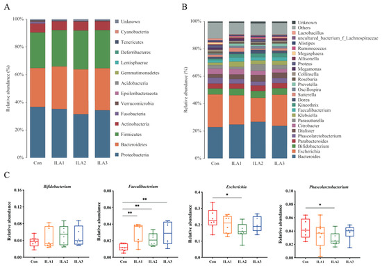 Changes in the relative abundances of bacterial communities. (A) Distribution of the predominant bacteria at the phylum level. (B) Distribution of the predominant bacteria at the genus level. (C) Compositional alterations of genera Bifidobacterium, Faecalibacterium, Escherichia and Phascolarctobacterium. Differences between Con group and each ILA group were analyzed by Student’s t-test. *, p < 0.05; **, p < 0.01.