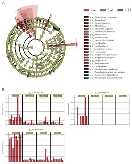 The effect sizes of each differentially abundant bacterial taxon were assessed by LEfSe (LDA > 3.0, p < 0.05). In Figure 4A, Ilumatobacter, Muribaculum, Lactilactobacillus, Lactococcus and Streptococcus were the potential biomarkers in the Con group, while species of Bacteroides coprocola, Desulfovibrio fairfieldensis and Parasutterella excrementihominis were common in the ILA2 group. In contrast, the bacterium with the most significant abundance difference in the ILA3 group was Phascolarctobacterium succinatutens. The histograms in Figure 4B show that the bacterial abundance of the genera Lactilactobacillus, Muribaculum and Ilumatobacter were all significantly decreased in the ILA-treated samples.