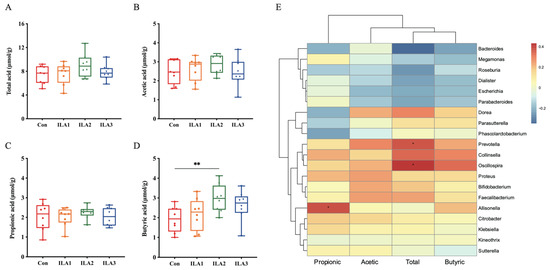 The content of SCFAs in fecal samples and the correlation analysis between SCFAs and microbiota. (A–D) Changes of SCFA contents included total acid, acetic acid, propionic acid and butyric acid in fecal samples. Differences between Con group and ILA group were analyzed by Student’s t-test. **, p < 0.01. (E) Heatmap of the relative abundance of gut microbiota and main SCFAs by Pearson. *, p < 0.05.