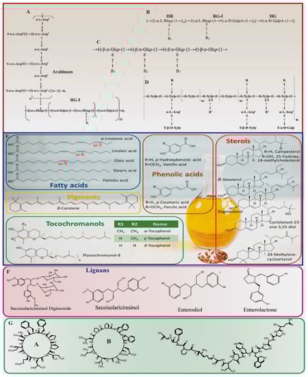 Overview of flaxseed bioactive compounds. (A) Proposed structure of KPI-ASF as RG-1 bridge-linked arabinans. (B) Proposed repeating unit of the acidic fraction gum (HR, RG-1, and HG refer to homorhamnan, rhamnogalacturonan-I, and homogalacturonan, respectively). (C) Proposed structure of KPI-EPF as xyloglucans. (D) Proposed structure of FM-NFG as arabinoxylans. (E) Flaxseed oil, phenolic acids, sterols, pigments, and tocochromanols. (F) Lignans and their metabolites. (G) Cyclolinopeptide-A, cyclolinopeptide-B, and alcalase-derived antioxidant peptide.
