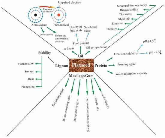 Flaxseed (Linum usitatissimum L.), commonly known as flaxseed or linseed, is an annual crop mainly grown for oil, fiber, food, and feed purposes. The significance of this crop has greatly increased in the modern world because of its exceptional nutritive content with a strong biological activity that has made its use possible in various applications such as functional foods, health supplements, and skincare products [,,]. The importance of flaxseed has also recently increased because of the newer trend of veganism among consumers all over the world and the number of social, ethical, religious, moral, environmental, and sustainability concerns associated with the consumption of animal-based products. This review paper focuses on the techno-functional properties of individual flaxseed components in foods that have never been reported in a comprehensive manner in one place before []. Flaxseed is becoming increasingly famous as a superfood because of its beneficial role in regulating gut flora and alleviating symptoms of many human diseases, such as cardiovascular ailments, diabetes, neural disorders, menopause, skin problems, gastrointestinal issues, and even cancers []. Furthermore, the proteins and cyclic peptides of flaxseed have been found to possess preferable antioxidant, antihypertensive, anti-inflammatory, immuno-suppressive, and anti-diabetic properties [].