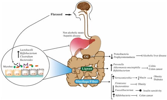 - Yang, C.; Wan, M.; Xu, D.; Pan, D.; Xia, H.; Yang, L.; Sun, G. Flaxseed powder attenuates non-alcoholic steatohepatitis via modulation of gut microbiota and bile acid metabolism through gut–liver axis. Int. J. Mol. Sci. 2021, 22, 10858. [Google Scholar] [CrossRef]