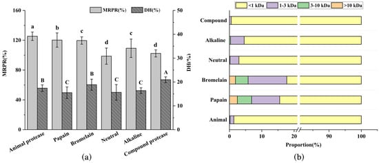 Relative proliferation rate of macrophages (MRPR) and degree of hydrolysis (DH) with different enzymatic hydrolysis products (a), and molecular weight distribution of different enzymatic hydrolysates (b). Different uppercase letters in the figure indicate significant differences in DH (p < 0.05); different lowercase letters indicate significant differences in MRPR (p < 0.05).