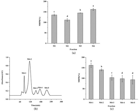 MRPR in each ultrafiltration fraction (100 μg/mL) (a); Sephadex G-15 gel chromatogram (b), and MRPR in each component (c). Different lowercase letters indicate significant differences in MRPR (p < 0.05).