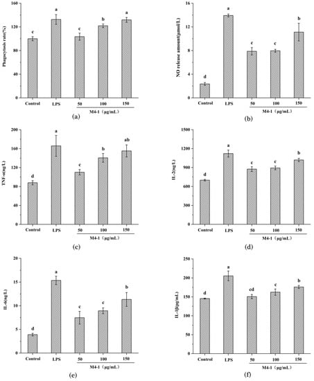 Macrophage phagocytosis, which protects against infections caused by foreign biotic and abiotic attacks, is an important indicator of the immunomodulatory role of macrophages [24]. The result of the phagocytosis of neutral red was presented in Figure 3a, with a dose-dependent phagocytosis of the M4-1 fraction in the range of 50 to 150 μg/mL. The phagocytosis of macrophages was greatly strengthened at medium and high concentrations of stimulation compared to the blank group, and the phagocytosis of the M4-1 fraction at high concentrations (131.86 ± 4.07%) was equivalent to that of the LPS-promoted cells. Similarly, it had been reported that the F31 fractions purified from oyster hydrolysates improved the phagocytosis effect in a positive correlation with the concentration [25].