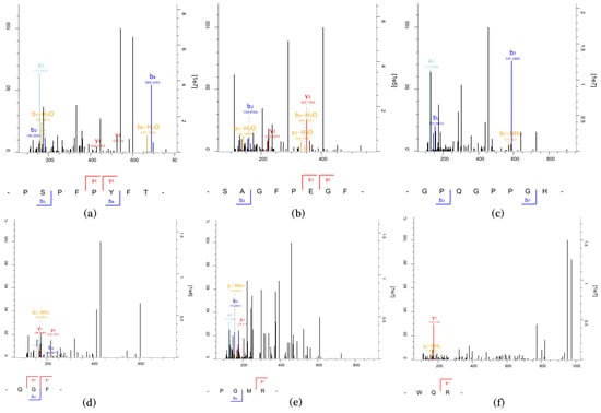 Combined with some previously reported studies on immunomodulatory peptides [5,30], the characteristics of peptides that may contribute greatly to their immune enhancement are mainly as follows: the peptides generally consist of 2 to 20 amino acids; the majority of amino acid residues in the peptides are the hydrophobic amino acids Trp, Phe, and Ala, etc., the branched amino acids Val, Ile, and Leu, etc., and the basic amino acids Lys and Arg; and the peptides have high hydrophobicity and pI. Thus, six immunomodulatory peptides, PSPFPYFT, SAGFPEGF, GPQGPPGH, QGF, PGMR, and WQR, were selected and their immunoreactivity was further determined. The MS/MS spectra of the six peptides are shown in Figure 4.