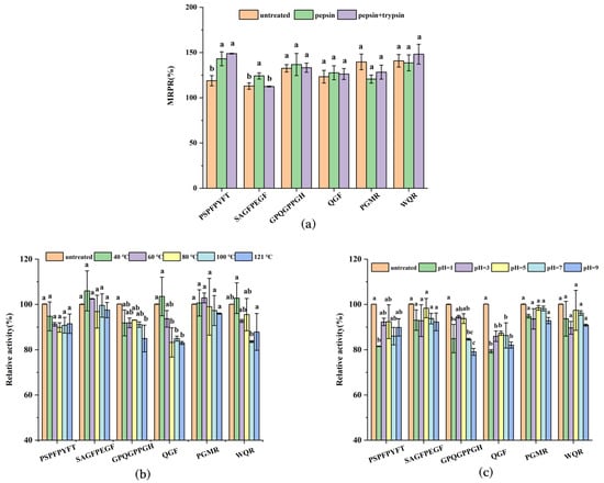 To evaluate the thermal stability of the synthetic peptides, six peptide solutions (1 mg/mL) were heated at 40 °C, 60 °C, 80 °C, 100 °C, and 121 °C for 30 min, and then cooled and lyophilized to assess their immune activity. The unheated treated samples (room temperature: 25 °C) were used as controls to compare their MRPR with the baseline values.