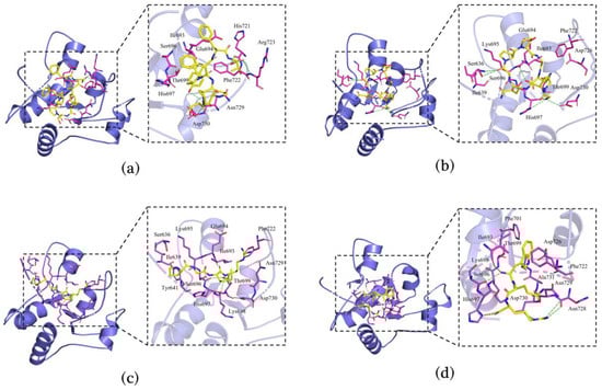 Binding and interacting residues of peptides with TLR4/MD-2 (ID: 5IJD). PSPFPYFT-TLR4/MD-2 (a), GPQGPPGH-TLR4/MD-2 (b), PGMR-TLR4/MD-2 (c), and WQR-TLR4/MD-2 (d). In the figure, green represents hydrogen bonds, yellow represents polypeptide ligands, and purple represents amino acid residues related to the action.