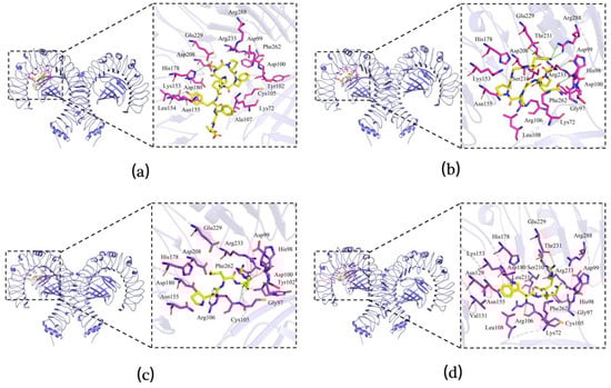Hydrogen bonds were formed between the receptor and the peptides, allowing for tighter binding of the peptides. In Figure 6a–d, four hydrogen bonds were formed between PSPFPYFT and the Phe722, Arg723, Asn729, and Asp730 residues of TLR2; seven hydrogen bonds were formed between GPQGPPGH and the Ser636, Glu694, Thr699, His697, and Asp730 residues of TLR2; two hydrogen bonds were observed between PGMR and the His697 and Ser696 residues of TLR2; and seven hydrogen bonds were observed between WQR and the Ile693, Ser696, His697, Asn728, and Asp730 residues of TLR2. As shown in Figure 7a–d, three hydrogen bonds were formed between PSPFPYFT and the Leu154, His178, and Glu229 residues of TLR4/MD-2; five hydrogen bonds were formed between GPQGPPGH and the Arg288, Glu229, and Asp99 residues of TLR4/MD-2; four hydrogen bonds were observed between PGMR and the Arg106, Asp100, and Arg233 residues of TLR4/MD-2; and there were seven hydrogen bonds observed between WQR and the Thr231, Glu229, His98, and Arg106 residues of TLR4/MD-2.