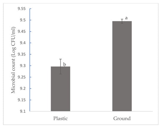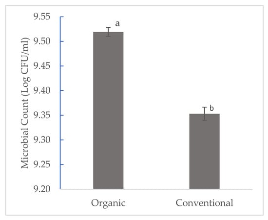 While there is numerous literature on the effect of farming systems on the microbial dynamics of many vegetables, there is a dearth of literature that focuses on the effects of farming systems on watermelon. Results from this study focus on the effects of organic and conventional farming systems on Enterobacteriaceae count in watermelon. Figure 1 shows that organic and conventional farming systems had a significant effect on the microbial count. Watermelon grown organically had a higher microbial count of 9.4013 log CFU, while that grown conventionally had a lower microbial count of 9.3532 CFU at p ˂ 0.05. Figure 2 shows that watermelon fruits in direct contact with the ground had a significantly higher microbial count of 9.4952 log CFU when compared to those on plastic mulch (9.2900 log CFU). Higher microbial diversity was observed in organic watermelon (eleven different strains on the ground and nine on plastic mulch) when compared to conventional (four on the ground and two on plastic mulch) watermelon. Furthermore, a higher microbial count of Enterobacteriaceae strains was also observed on watermelon directly on the ground when compared to those on plastic mulch. In their study, [] evaluated the effects of organic and conventional production systems on microbiological analyses of lettuce, radish, carrot, and beetroot. The results showed that vegetables cultivated under an organic management system had a significantly higher load of Enterobacteriaceae compared to those conventionally cultivated. Similar findings were also reported by other researchers such as [,]. This may be because organic agriculture focuses on the use of natural processes to improve soil microbial activities []. Plastic mulch as a barrier on the soil surface may reduce the number of microbes reaching the surfaces of fruits, thereby resulting in a lower microbial count and diversity while also causing changes in soil physical and chemical properties and microbial activities []. This is in agreement with the findings in our study. Watermelon fruits on plastic mulch had a significantly lower microbial count compared to watermelon fruits in direct contact with the ground.