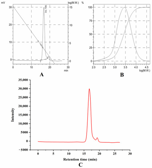 Gel permeation chromatography of chestnut starch nanocrystal. (A) Chromatogram and calibration curve. (B) Molecular weight distribution curve. (C) Intensity of molecular weight.
