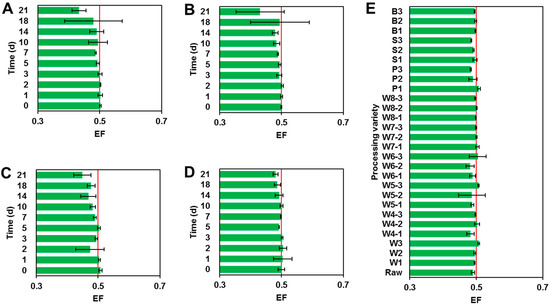 EF values of penthiopyrad in eggplant samples under field conditions. (A–E) represent spraying dose of 75 g a.i./ha two and three times, spraying dose of 99 g a.i./ha two and three times and processing, respectively.
