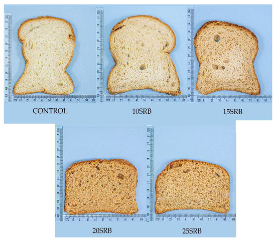 Notable differences regarding bread volume and height were observed between the different SRB bread formulations (Table 5). The volume of bread ranged from 1061 cm3 in control bread to 750 cm3 in breads with the highest SRB level (25%). Reductions in bread volume between 7% and 29% were observed depending on the percentage of SRB incorporation. The characteristic high volume of wheat-based breads can be attributed to their gluten content, which allows the retention of the gas produced during fermentation and reflects the ability of bread dough to expand [39]. The replacement of wheat flour with SRB flour causes a gluten-dilution effect and the disruption of the gluten network by the reaction of fiber with gluten proteins [35], thus reducing the bread’s air-holding capacity and, consequently, the bread volume. Similarly, the height of bread loaves decreased as the SRB amount increased, from 3% in 10SRB bread to 28% in 25SRB formulation, due to the lower gluten content compared with the control, corroborating the results observed for bread volume.