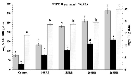 GABA content variation as a function of SRB substitution ratio is shown in Figure 2. SRB-fortified breads showed higher amounts of GABA (14.11 mg/100 g d.m.) compared with control bread (24.79 mg/100 g d.m.). The highest GABA content was observed for the highest substitution ratio (25SRB bread). Wheat flour has a low GABA content whose concentration varies from 3 to 78 mg/100 g depending on wheat variety [55]. A previous study has demonstrated that RB is a source (634 mg/100 g) of GABA [56]. Taken together, increased GABA content in bread may be mainly attributed to SRB fortification.