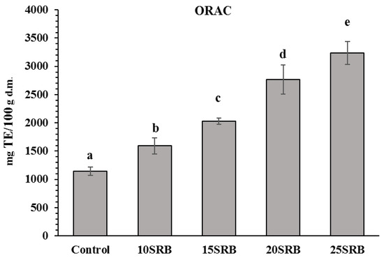 SRB bread fortification significantly affected the amount of bioactive compounds (Figure 2) and antioxidant activity (Figure 3).