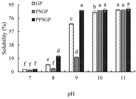 Protein solubility of GP, PSGP, and PPSGP. Different letters indicate significant differences.