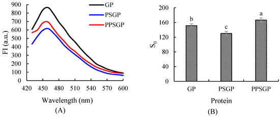 Surface hydrophobicity could reflect the degree of protein unfolding and the exposure of hydrophobic groups on the surface, which influences the hydrophobic interaction between proteins and their emulsifying, foaming, and gelling capacities [37]. Figure 2A shows the surface hydrophobicity of GP, PSGP, and PPSGP by fluorescence spectroscopy. The maximum fluorescence emission was found at 460 nm for all groups. Good emulsifying activity depends on the balance between hydrophobic and hydrophilic groups [38]. Different treatments interfered with the balance of surface hydrophobicity, which increased or decreased. PSGP showed lower FI due to changes in goose liver proteins than GP and PPSGP. Double pH shifting made protein molecules shrink and refold, leading to protein denaturation. Under unstable tertiary and quaternary structures, the hydrophobic groups that were previously exposed on the protein molecule surface were buried in the interior regions of the protein in aqueous environment because of denaturation. Less ANS had access to bind with previous non-polar parts of protein molecules. Thus, the surface hydrophobicity of proteins decreased. This variation in fluorescence may have also resulted from different energy transfer efficiencies between tryptophan (Trp) and tyrosine [39] or the enclosure of the chromophores. As shown in Figure 2B, PPSGP showed the highest S0. Non-enzyme phosphorylation of goose liver proteins significantly enhanced the surface hydrophobicity (p < 0.05). During the process of non-enzyme phosphorylation treatment, the phosphate groups were bound to proteins, which changed their surface charge [40,41], thereby contributing to the change in protein surface hydrophobicity.