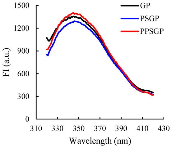 The intrinsic fluorescence spectrum was generally used to characterize the changes in tertiary structure of proteins due to the sensitivity of intrinsic fluorescence of aromatic amino acid residues to the polarity of microenvironments [33,42]. It is mainly attributable to Trp. Thus, fluorescence spectroscopic analysis is suitable for the evaluation of changes in the tertiary structure of GPI. As shown in Figure 3, the maximum emission wavelength (λmax) values of GP, PSGP, and PPSGP were 345, 346, and 345 nm, respectively. Compared with the FI of GP, that of PSGP remarkably decreased. The double pH shifting process altered the compact structure of goose liver proteins, thereby changing the extent of the exposure of chromophores to the solvent [9]. This result was consistent with the change trend in surface hydrophobicity (Figure 2), which showed less exposure of hydrophobic groups due to the refolding of GPI. Moreover, partial refolding of protein molecules due to the double pH shifting process may increase the internal quenching, which also contributed to the decrease in FI [43]. PPSGP showed the highest intrinsic FI at 345 nm. Phosphorylation could introduce charged and hydrophilic groups in the side chain of amino acids and change ion strength, altering the structural conformation of proteins [36]. Therefore, the addition of sodium tripolyphosphate and the introduction of phosphate groups changed the protein functionality of GPI and increased its FI. The introduction of phosphate groups and ion strength also led to higher FI of PPSGP when compared to that of GP.