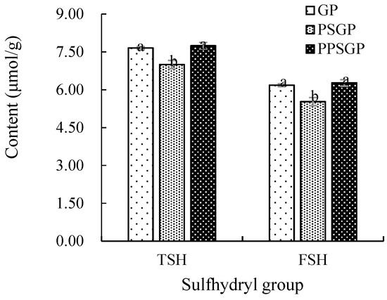 Sulfhydryl content of GP isolate. TSH: total sulfhydryl; FSH: free sulfhydryl. Different letters indicate significant differences.