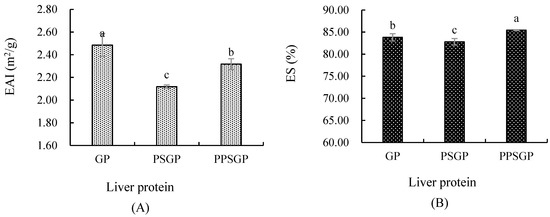Emulsifying activity and emulsion stability of goose liver protein isolate. (A) EAI, emulsifying activity index; (B) ES, emulsion stability. Different letters indicate significant differences.