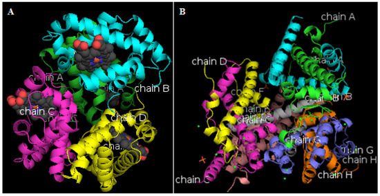 Structures of hemoglobin subunit alpha-A and ATP synthase subunit beta. (A) hemoglobin subunit alpha-A; (B) ATP synthase subunit beta.