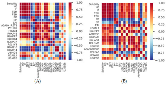 The correlations between the parameters above and the top 10 proteins and phosphorylated proteins are shown in Figure 7. For protein properties, the solubility of GPI was highly and positively related to S0, IF (peak value), TSH, and FSH and highly and negatively related to particle size. The EAI was positively related to solubility, TSH, FSH, S0, and IF (peak value of intrinsic fluorescence) and highly and negatively related to particle size. As for the top 10 proteins of the highest signal strength (Figure 7A) and phosphorylated proteins (Figure 7B), the solubility was highly and positively correlated with A0A0K1R5T3, R0KA48, R0KFP7, U3J1L1, P01989, R0JSM9, R0LAD1, R0LCM7, and A0A068C605 and highly and negatively related with R0M210, R0M714, and R0LFA3. The EAI showed a high relationship with A0A0K1R5T3, P01989, R0JKI4, R0KA48, R0KFP7, R0KK84, R0L1Y3, R0JSM9, R0LAD1, R0LCM7, A0A068C605, U3IQ39, and U3IW62. However, the EAI was highly negatively correlated with R0M210 and R0M714. Therefore, pH shifting and non-enzyme phosphorylation could change the original natural structures and composition of GP, thus affecting its functional properties.