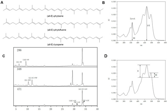 Structures of phytoene (PT), phytofluene (PTF) and lycopene (LYC), and isomer determination methods. (A) Structures of PT, PTF and LYC. (B) The calculation method of Q value (DB/DІІ). (C) HPLC analysis of PT, PTF and LYC isomers. (D) The calculation method of %Ⅲ/Ⅱ.
