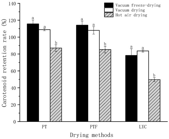 Sometimes, the retention rates in the data were larger than 100%, which did not mean that new carotenoids were generated during the drying process. Because carotenoid synthesis requires the participation of enzymes in tomatoes [9], the drying process has broken this condition. The retention rate was obtained by comparing the carotenoid content of processed tomato powder with that of fresh tomato pulp. However, the extraction effect of PT, PTF and LYC from fresh tomato pulp was inferior to that of tomato powder. Extensive literature suggests that cell walls and chromoplasts (i.e., the carotenoid-containing plastids) appear as the major barriers limiting carotenoid diffusion [44]. The process has a positive impact on carotenoid release from fruit and vegetables, with the loss of the food matrix structure [18,20,41]. The authors believe that the plant cells in the fresh tomato pulp were relatively intact and fully packed with water, which affected the penetration of organic reagents into the plant cell structure to dissolve carotenoids. Therefore, the extracted carotenoid content of fresh tomato pulp was lower than that of dry powder. Fortunately, most of the samples in this research were extracted uniformly in dry powder form, which did not affect the conclusion [42].