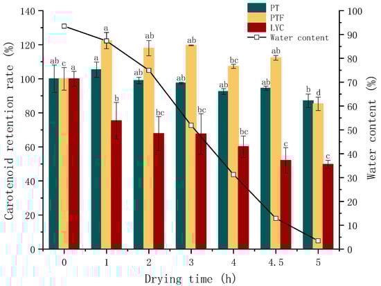 Therefore, the changes in the PT, PTF and LYC retention rates during HAD were monitored (Figure 4). The stability of PT, PTF and LYC during HAD was related to the change in water content. When the water content decreased from 30% to 3.5%, the retention rates of PT, PTF and LYC decreased significantly (PT from 97% to 87%, PTF from 120% to 85%, LYC from 68% to 50%), and the decrease was much higher than that in the first 4 h (almost no decrease was observed). Zhang [21] found that under HAD, after the water content reached 15%, the LYC content decreased significantly. It was speculated that at low water content, PT, PTF and LYC lost their water packets and were more easily oxidized when exposed to air [40]. Lavelli [41] found that LYC was less stable in by-products of low water or water activity, suggesting that, in parallel, both cis and trans isomers of LYC auto-oxidize, forming volatile fragments. The effects of thermal treatment at 80 °C on the total LYC concentration in the water-based and oil-based samples were very similar, provided that the oil had a good ability to isolate oxygen. Therefore, when the heating temperature was lower or slightly higher than 80 °C, water could compete with oxygen for the active absorption sites [42]. The decrease in LYC retention was always accompanied by the drying process, and the decrease was more significant than that of PT and PTF. LYC was affected by both oxygen and temperature [24] and was more prone to isomerization, which was usually the first step in degradation [43]. In addition to water content, other antioxidant components in tomato may also play a role in PT, PTF and LYC resistance to oxidation [21].