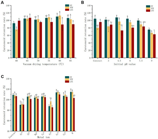 The effects of different conditions on retention rates of PT, PTF and LYC under vacuum drying. (A) The effects of different vacuum drying (VD) temperatures under 0.1 mpa; (B) different initial pH values at 80 °C and (C) 0.1 mPa and different metal ions with a concentration of 1 mmol/L at 80 °C and 0.1 mPa on the retention rates of tomato powders. Tomato powder dried directly from untreated tomato pulp was used as a control. The raw material was the mixed tomato pulp of five tomato varieties selected. The retention rate was obtained by comparing tomato powder with tomato pulp material (preheated in a 60 °C water bath for 10 min). Different letters between columns of the same color are significant (p < 0.05), according to Duncan test.