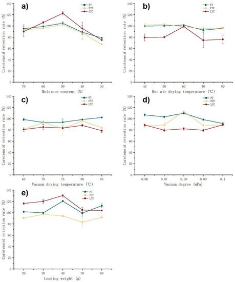 The influence of changeover water content, HAD temperature, VD temperature, VD vacuum and loading weight on retention rates is shown in (a–e), respectively. Besides the parameters explored, other parameters were as follows: (a) HAD temperature 60 °C, VD temperature 80 °C, VD vacuum 0.1 mPa and loading weight 30 g; (b) MTP 50%, VD temperature 80 °C, VD vacuum 0.1 mPa and loading weight 30 g; (c) changeover water content 50%, HAD temperature 60 °C, VD vacuum 0.1 mPa and loading weight 30 g; (d) changeover water content 50%, HAD temperature 60 °C, VD temperature 80 °C and loading weight 30 g; (e) changeover water content 50%, HAD temperature 60 °C, VD temperature 80 °C and VD vacuum 0.08 mPa. The raw material was the mixed tomato pulp of five tomato varieties selected. The retention rate was obtained by comparing tomato powder with tomato pulp material (preheated in a 60 °C water bath for 10 min).