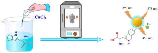 L-tryptophan and CuCl2 · 2H2O were dissolved in 20 mL of H2O at a ratio of 1:1.7. After 5 min of ultrasonic cleaning, a mixed clear-blue solution was obtained. The solution was poured into a specific 50 mL reaction container and placed in a constant temperature oven at 180 ℃ for 6 h, then centrifuged at 10,000 rpm for 12 min. Finally, a 0.22 μm microporous filter was used to filter the supernatant in order to obtain a relatively purified product. It was stored in a refrigerator at 4 °C for future experimental use.