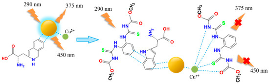 We introduced Cu2+ onto CDs to synthesize double-emission fluorescence quantum dots (Figure 1). The synthesis process has the advantages of a simple operation, cheap and easy access to raw materials and environmental protection. N, S and O elements with lone pair electrons in TM can chelate with Cu2+, and benzene ring in TM can occur in π-π recognition with a benzene ring in Cu-CDs, which leads to fluorescence quenching [4]. Therefore, a synchronous bipeak response strategy for the detection of TM was established in our work (Figure 2). We also provided fast, accurate and reliable information for the quantitative determination of TM in practical samples.
