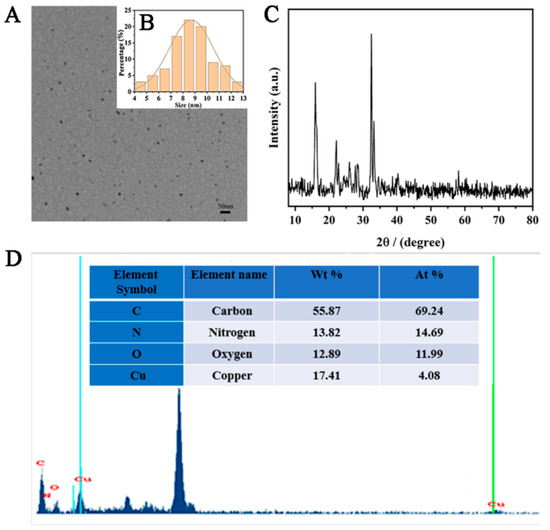 (A)TEM image, (B) particle size distribution, (C) X-ray diffraction and (D) EDS of Cu-CDs.