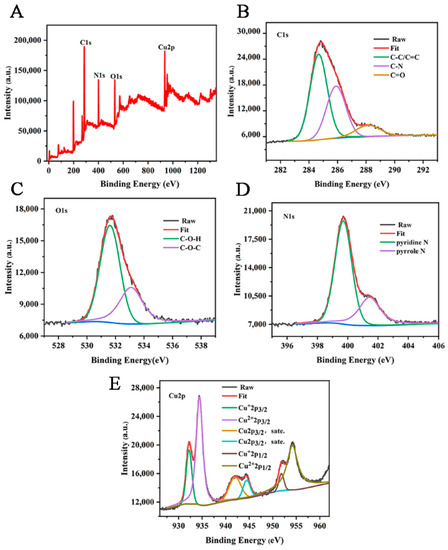 (A) XPS full-spectrum scan and high-resolution spectra of C 1s (B), O 1s (C), N 1s (D) and Cu 2p (E) of Cu-CDs.