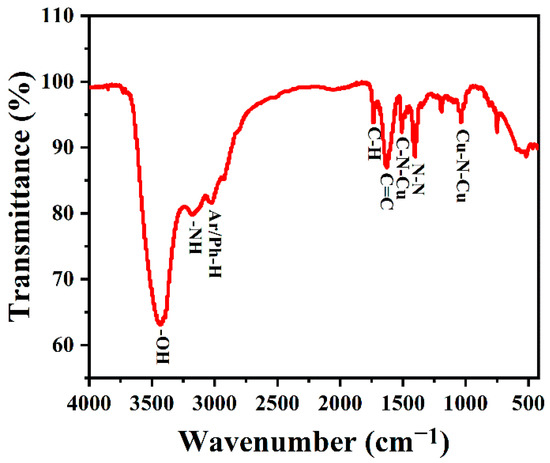 TQ Analyst software was used for spectral analysis. After adding KBr, the samples were made into tablets for infrared testing. The FTIR spectra were used to further study the composition of the surface functional groups of the synthesized copper-doped quantum dots. As shown in Figure 5, the characteristic peaks at 3450 and 3170 cm−1 belong to O-H/N-H stretching vibration, and the C-H stretching vibration of the indole ring of l-tryptophan is about 2920 cm−1. Meanwhile, the band at 1735 cm−1 was attributed to the frequency doubling of hydrocarbons outside of the benzene ring, which reflects the existence of its conjugate plane. The absorption peak at 1629 cm−1 belongs to the C=C stretching vibration of an aromatic ring, and the absorption peak at 1403 cm−1 belongs to N-N stretching vibration, where the bands near 1509 and 1035 cm−1 are C-N-Cu and N-Cu-N stretching vibrations, respectively [46], which proved that copper was successfully incorporated into the carbon quantum dots.